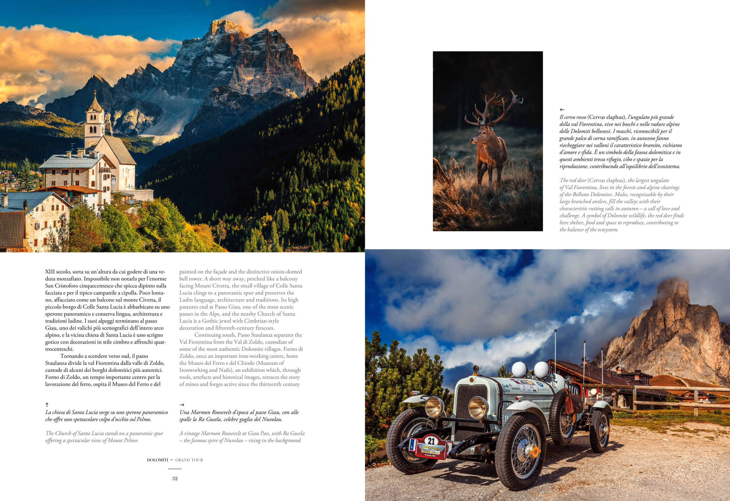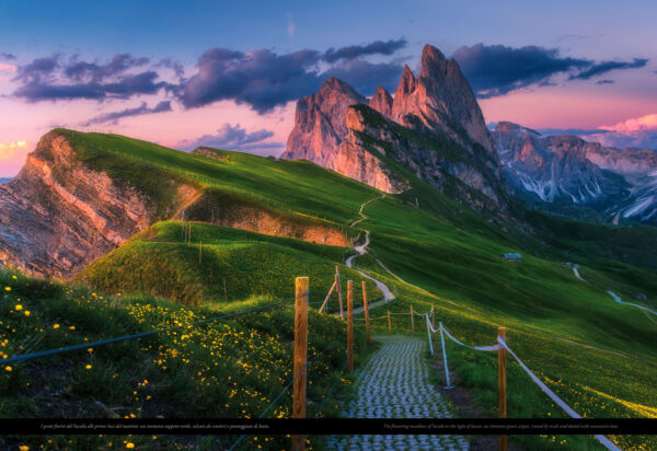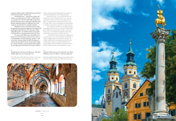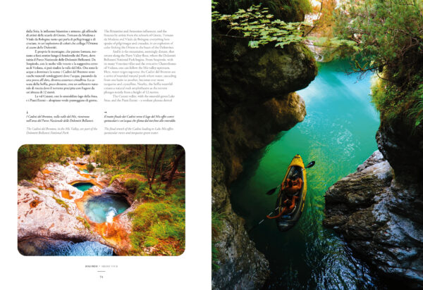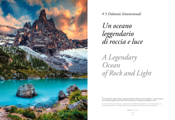 Dalle imponenti pareti del Pelmo e della Marmolada alle guglie delle Pale di San Martino, dai silenzi remoti delle Dolomiti Friulane alle vette iconiche delle Tre Cime di Lavaredo, il libro attraversa paesaggi grandiosi e vallate che custodiscono antiche memorie, borghi affrescati e foreste incontaminate. Pagina dopo pagina, il percorso prosegue svelando le forme perfette del Puez-Odle e i panorami della val Gardena, tra sculture in legno e tradizioni ladine; i regni incantati dello Sciliar-Catinaccio e del Latemar, dove l’enrosadira tinge le cime di rosa come nel leggendario giardino di Re Laurino; la profonda gola del Bletterbach, il “grande libro della Terra” che rivela milioni di anni di storia geologica; e...